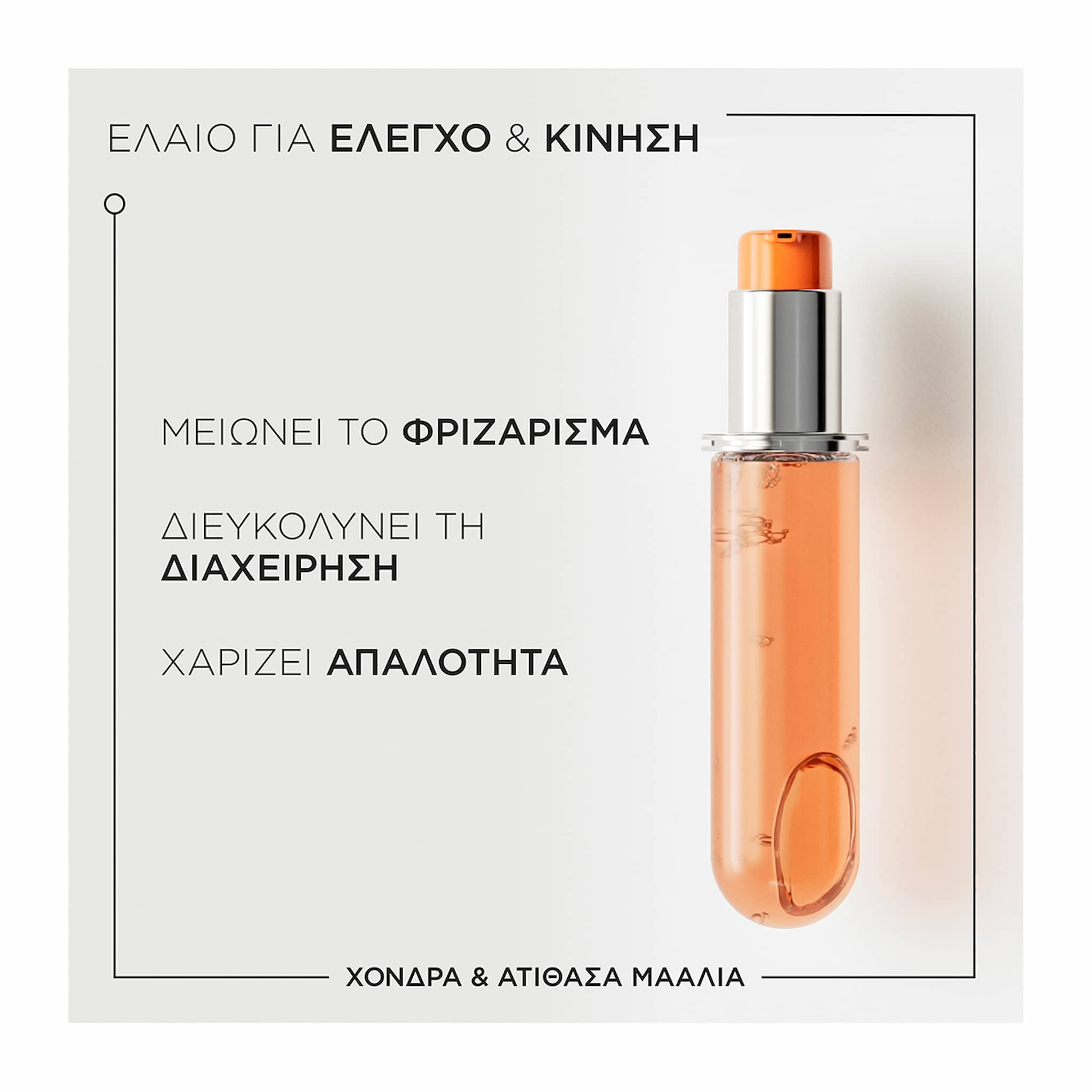 ΦΡΕΣΚΑΡΙΣΜΑ:Εφαρμόστε μια σταγόνα στις άκρες των μαλλιών στη διάρκεια της ημέρας για πειθαρχημένα μαλλιά και διατήρηση του πρωΐνού χτενίσματος.